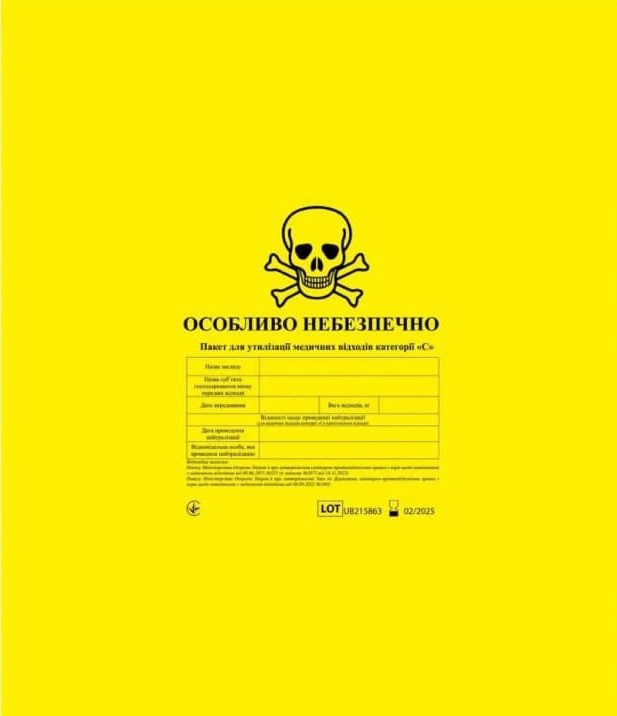 Пластикові пакети для біологічно небезпечних медичних відходів, розроблені для безпечної утилізації медичних відходів, що регламентовано законодавством. Виготовлені в жовтому кольорі, мають маркування “Особливо небезпечно” та символ біологічної небезпеки. Напис виконано українською мовою. На пакеті нанесено табличку для маркування відходів. Виготовлені з міцного поліетилену.